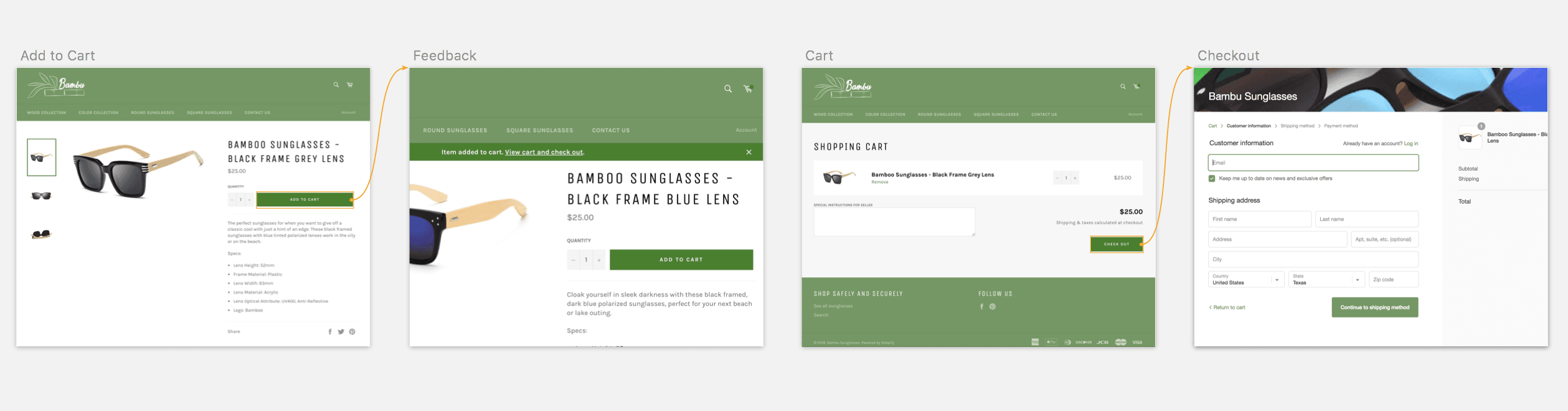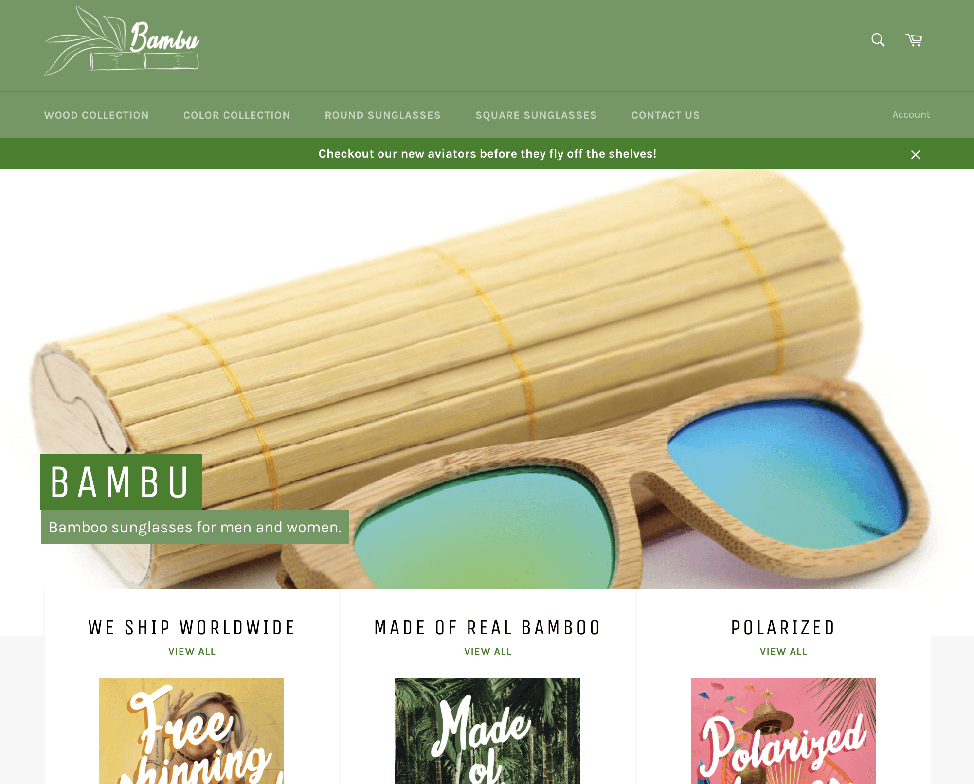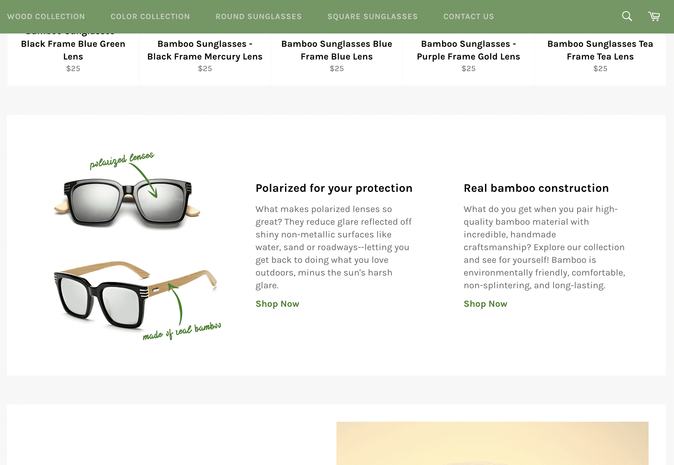 A good e-commerce experience has three major "containers." Starting from the top, you're hit with the WOW, then see product, then close with product features. Most users should ideally be interested by the time they see product, but this final container is designed to grab the holdouts and skeptics. Why Bambu sunglasses? They're polarized, they're solidly constructed from real bamboo, and they protect your eyes with UV shielding.